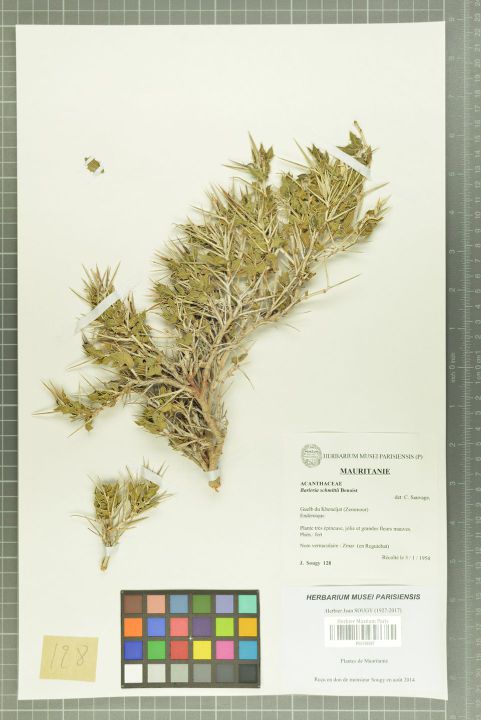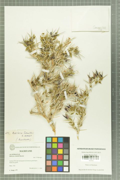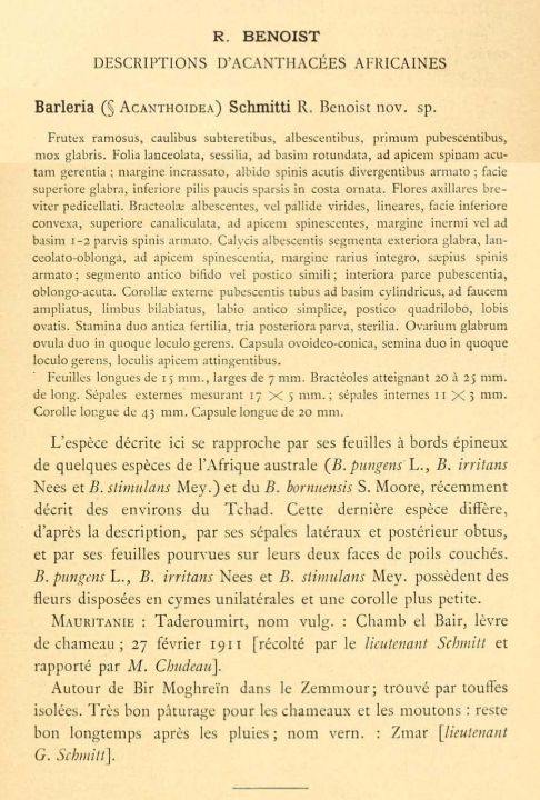 Barleria schmittii est une plante endémique rare du Sud marocain et de la Mauritanie. Elle est régulière dans les guelbs autour de Bir Moghrein dans le Zemmour mauritanien.