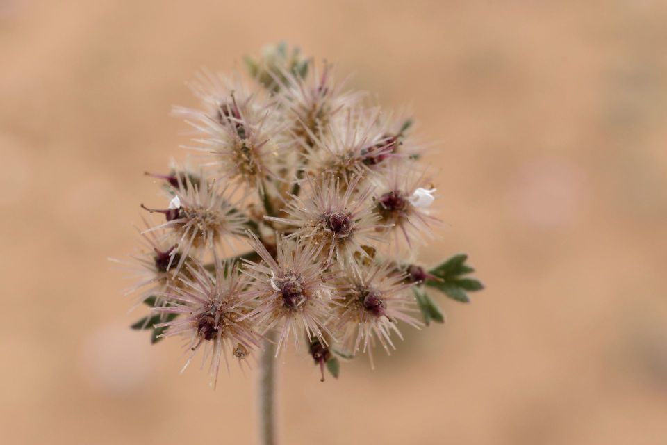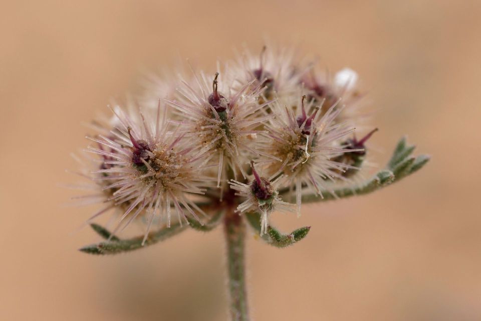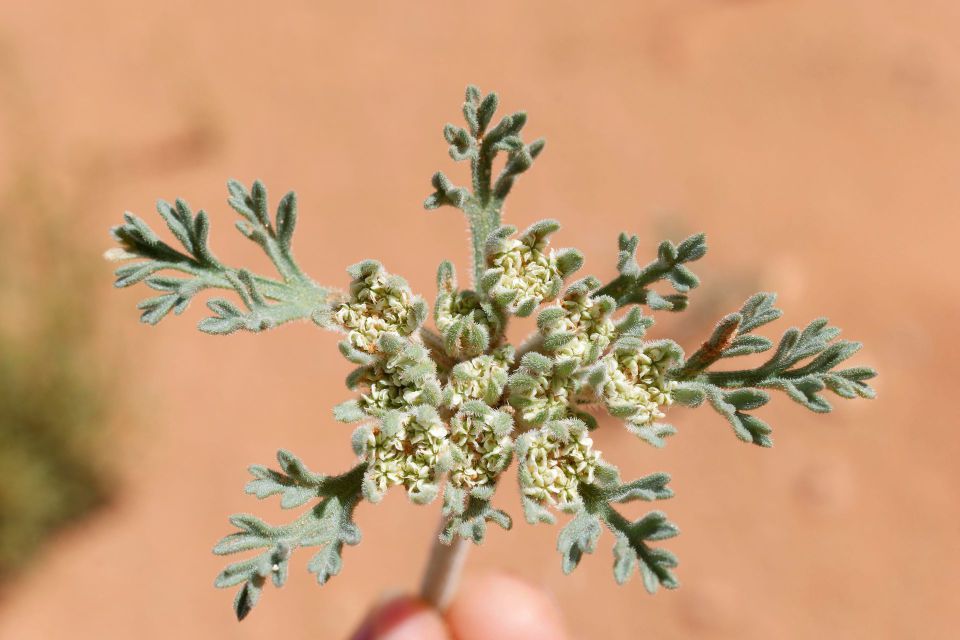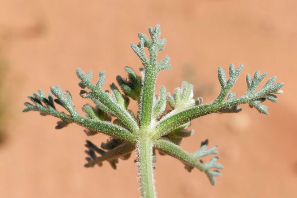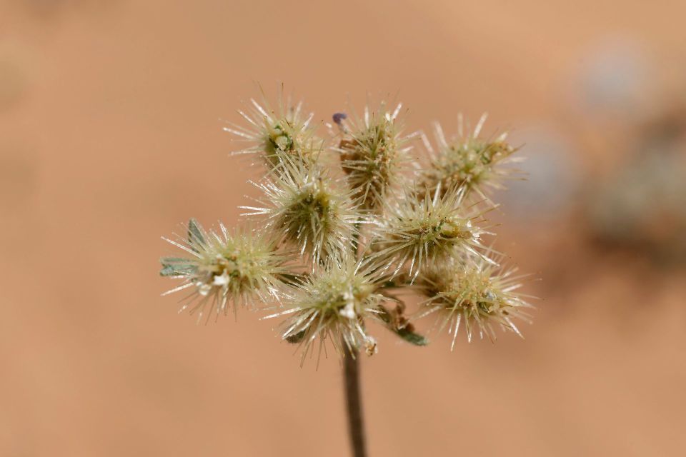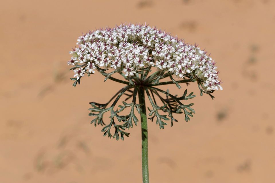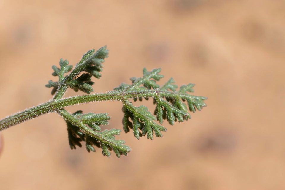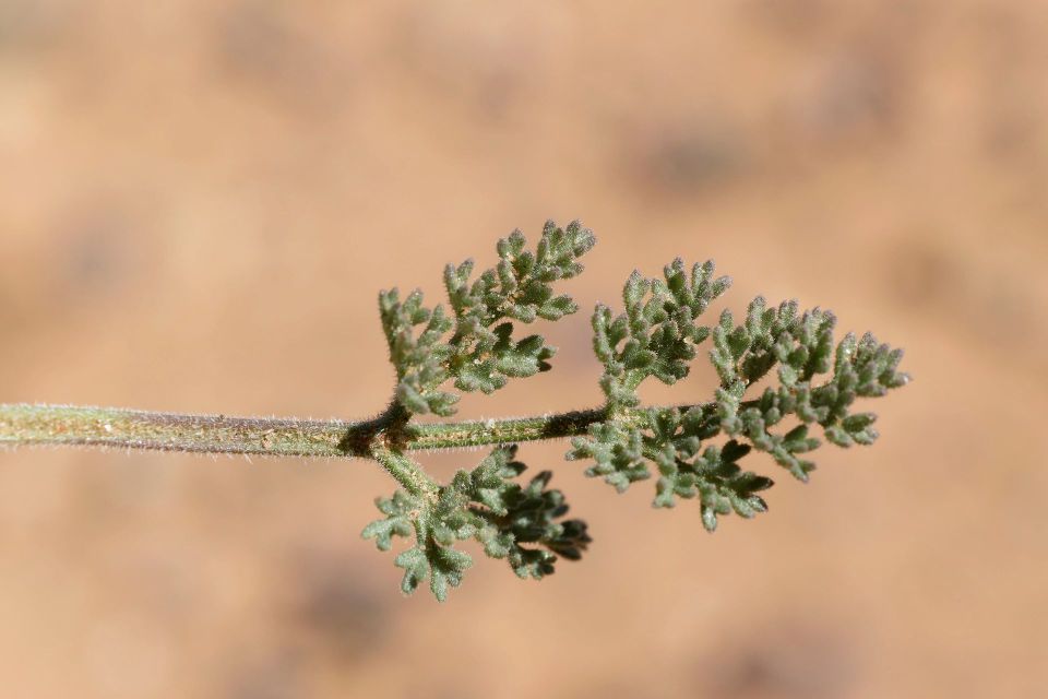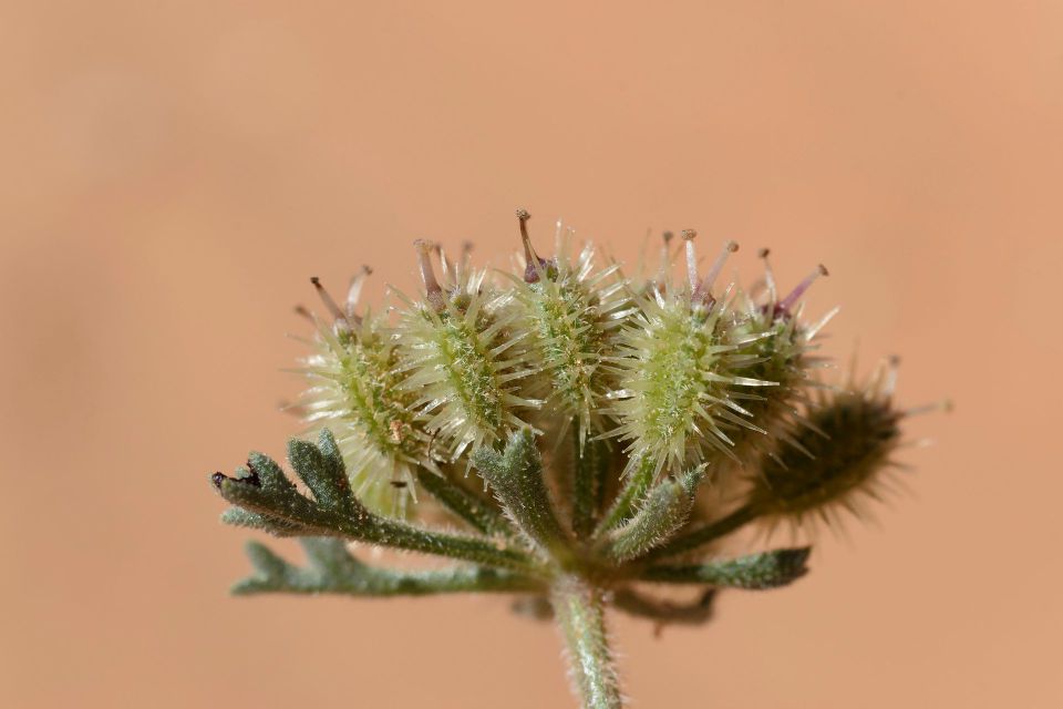 Planta annua vel biennis, undique pilis patentissimis rgidis dense vestita, cinarescens. Caulis 0,5-1,5 dm altus, striatus, plerumque jam basi ramos adscendentes vel erecto-patulos 1-2 dm longos rigidos emittens, rarius subsimplex erectus. Folia ambitu late ovata, obtusa, 3-pinnati-parta, segementis ultimis brevibus, oblongis, obtusis. Umbellae pedunculis rigidisinsidentes, frucu maturo non vel vix contractae, diamertro 4-8 cm; radii 5-12, plerumque subaequilongi. Involucri phylla radiis exterioribus paulo breviora; petiolus basi nervo debili percursus, mollis, marginibus non vel angustissime albo-scariosis;lamina ambitu triangularis, obtusa, petiolo brevior, bipinati partita, segmentis primi ordinis patentibus approximatis, ultimis oblongis, omnibus mollibus obtusis. Involucelli phylla interiora pedicellis subbrevoria, integra vel subintegra, marginibus anguste albo-scariosa; extaeriora radios umbellulae plus minus superantia, basi mollia et marginibus non vel vix scariosa, apicem versus trifida, segmenti brevibus, obtusis, mollibus. Petala flavenscentia, exteriora non vel vix radianta. Stylopodia sensim in stylos abeuntia, subconica. Styli crassiusculi, stylipodio circ. 4-plolongiores, mericarpiis circ. duplo breviores. Mericarpia 4-5 mm longa; juga primaria setulis dense obsita, secundaria aculeis glochidiatis, distincte biseriatis, valde approximatis, latudine fructus subduplo longioribus armata.