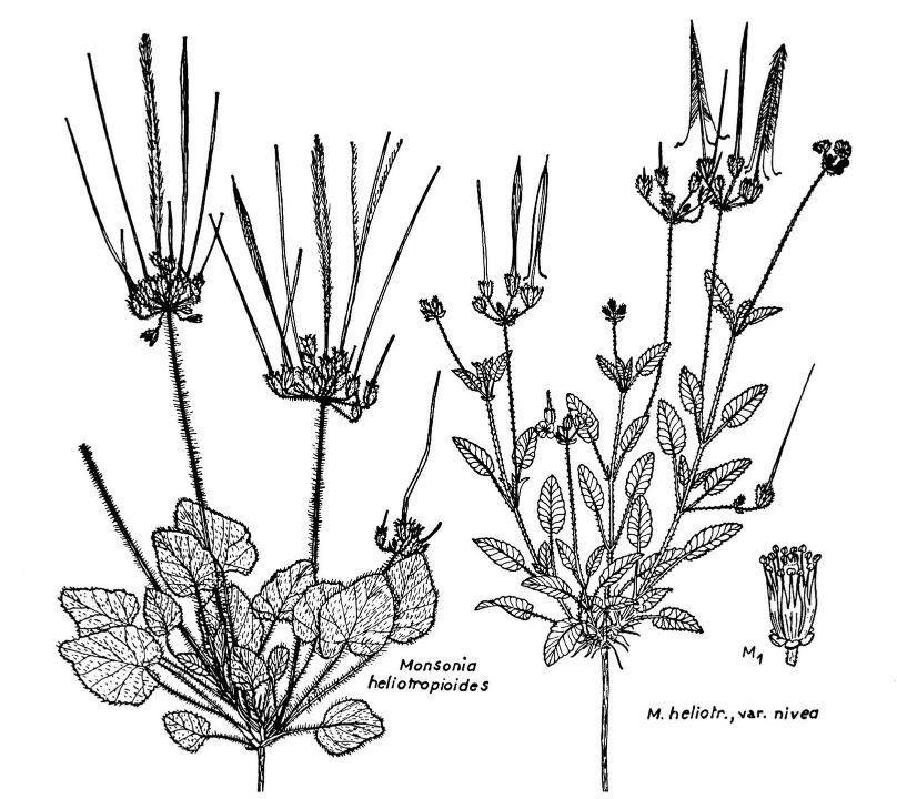 Monsonia heliotropioides est bien présent dans les montagnes du sud du Sahara. Les deux points au nord-ouest de l'Algérie sont probablement une confusion avec Monsonia nivea. Les points en Mauritanie correspondent à une population qui a une morphologie (essentiellement la pilosité des tiges et des feuilles) intermédiaire entre M. heliotropioides et M. nivea.