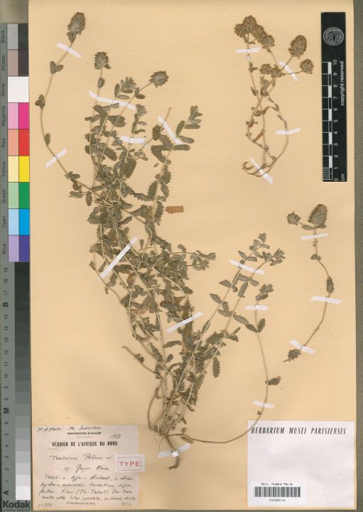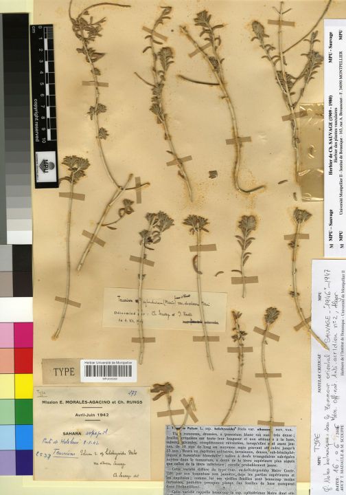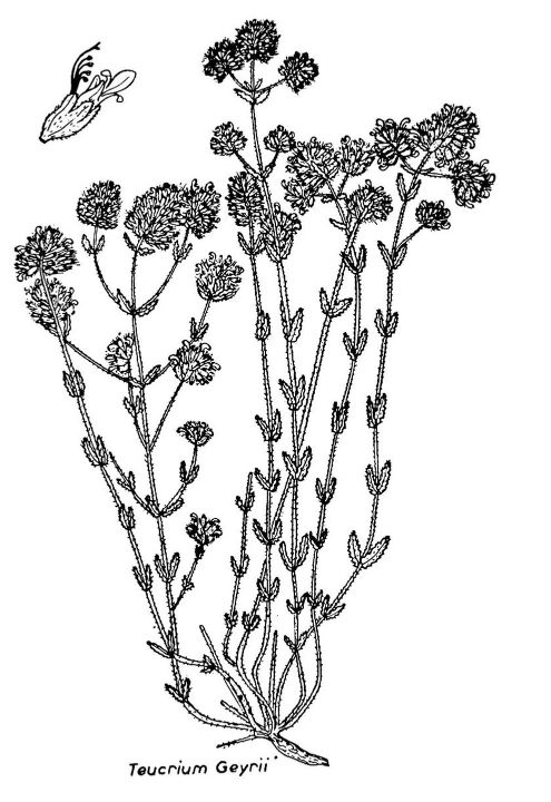 Teucrium helichrysoides = T. polium subsp. helichrysoides Maire = T. polium subsp. geyrii Maire est une espèce du groupe de Teucrium polium rare dans le Sahara et que je n'ai pas encore observée. Les seules photos que j'en connais ont été prises par Léo Giardi dans le Hoggar et publiées dans :
