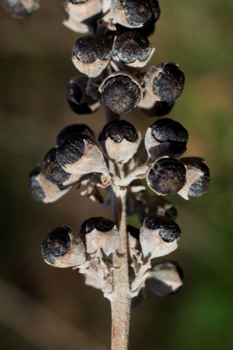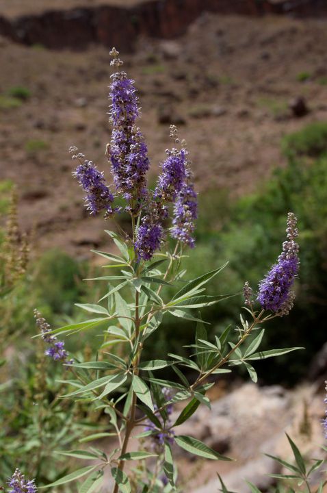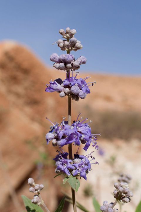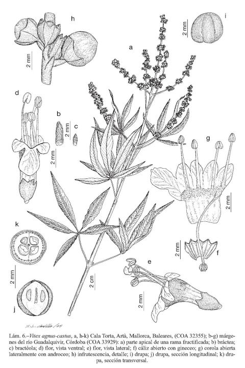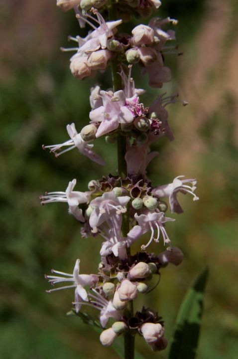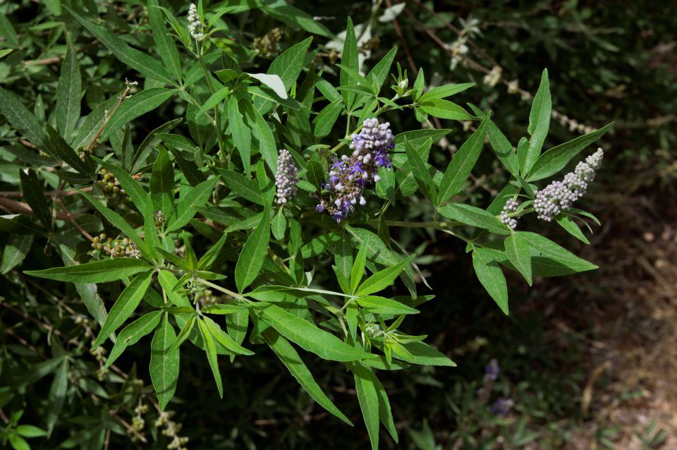 Le gattilier est un arbuste ou un petit arbre qui se reconnait à ses feuilles digitées de 3 à 7 folioles et à ses grappes de petites fleurs blanches, roses ou bleues.