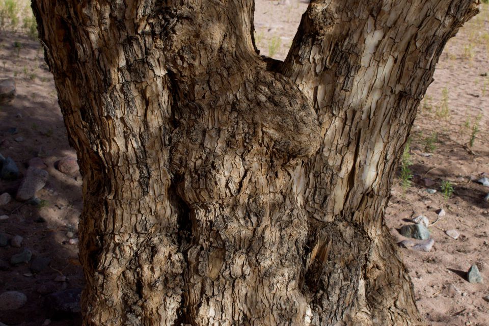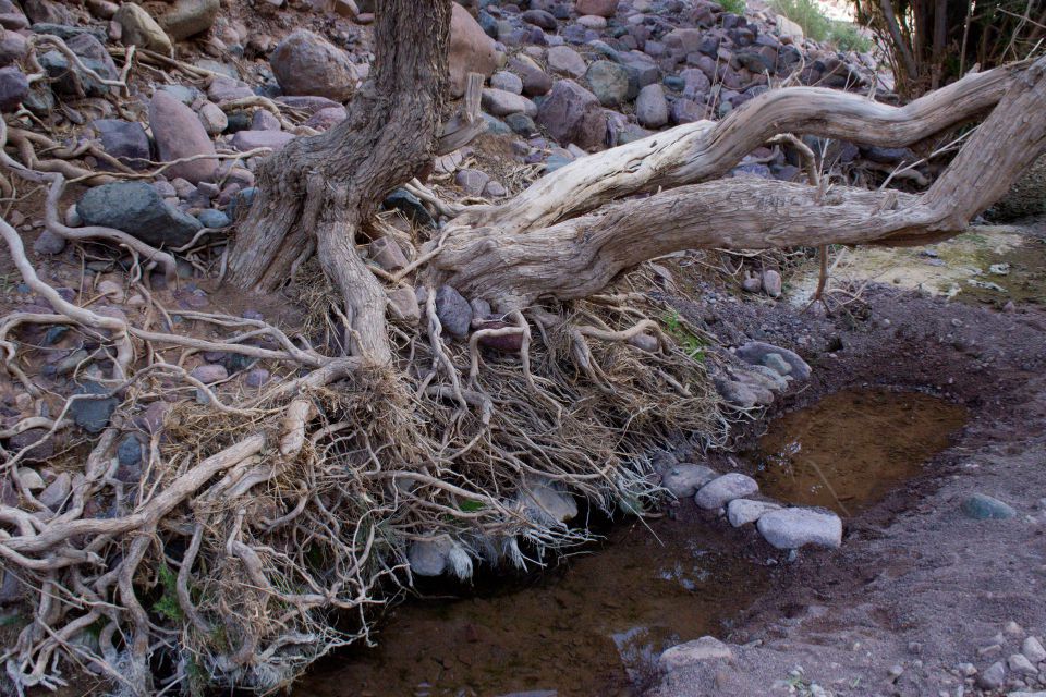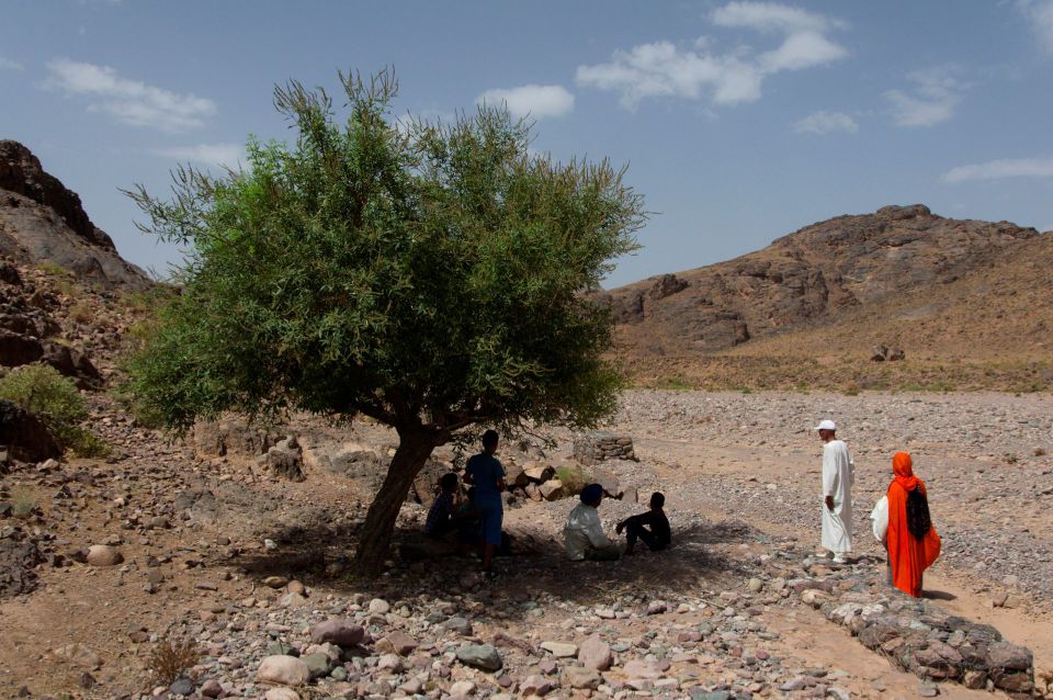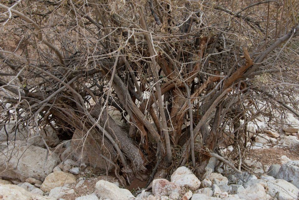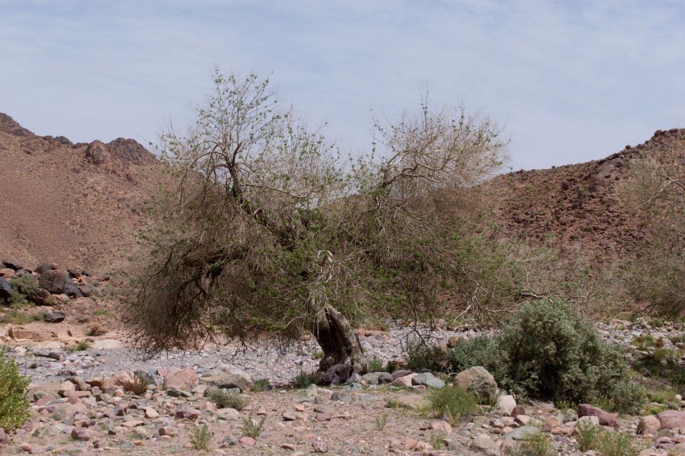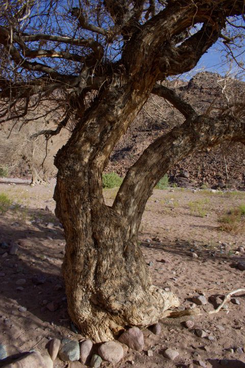 Ce très vieux pied tourmenté a du se battre contre les crues dévastatrices de l'oued lorsqu'il charrie des blocs de pierre, contre la hache des bergers qui cherchent piquets ou bois de feu et contre les dents rageuses des ânes et des chèvres.